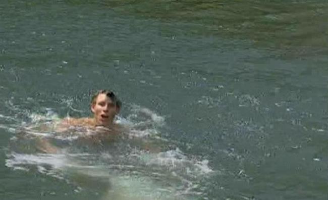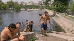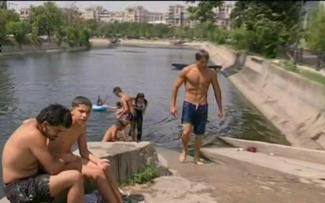 O mana de tineri incinsi de razele fierbinti vor cu tot dinadinsul sa se racoreasca. Si unde s-ar putea scalda gratis, daca nu in Dambovita.