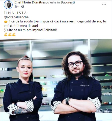 „F I N A L I S T A @roxanablenche. Încă de la audiții ți-am spus că dacă nu aveam deja cuțit de aur, tu erai cuțitul meu de aur! Şi uite că nu m-am înşelat! Felicitări!”, a scris Florin Dumitrescu.
