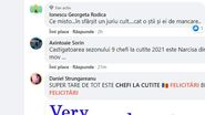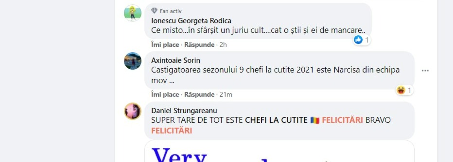 „Vă mulțumesc, vă mulțumesc din suflet. Nici nu știți cât înseamnă astea trei pentru mine. Vă mulțumesc, chef Cătălin, te iubesc. Vă mulțumesc, vă iubesc și vă ador, sunteți preferații mei. Mi-ați dat cea mai mare bucurie pe care poate să o aibă un om în seara asta. Mulțumesc foarte mult, chefi”, spunea concurenta cu lacrimi în ochi.
