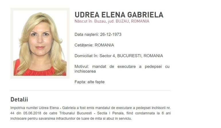 Fostul ministru al Turismului, Elena Udrea, a fost dată în urmărire generală, după ce a fost condamnată la șase ani de închisoare în dosarul ”Gala Bute”. Blondina nu a fost găsită nici la adresa din buletin, nici la adresa din Corbeanca, acolo unde locuia alături de familia sa, pentru a fi încarcerată în urma condamnării.