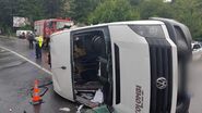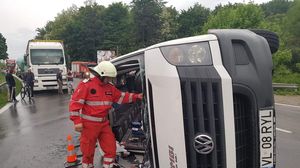 Un microbuz în care se aflau 12 persoane a fost lovit puternic şi răsturnat după impactul cu semiremorca unui TIR condus de un cetăţean de 34 de ani, din Belarus.