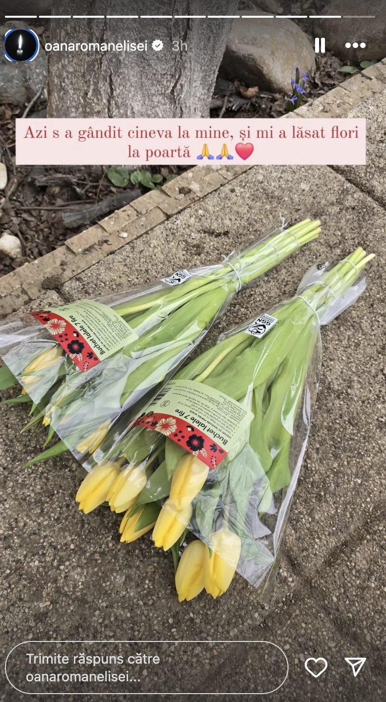 „Azi s-a gândit cineva la mine și mi-a lăsat flori la poartă”, a scris Oana Roman în mediul online.