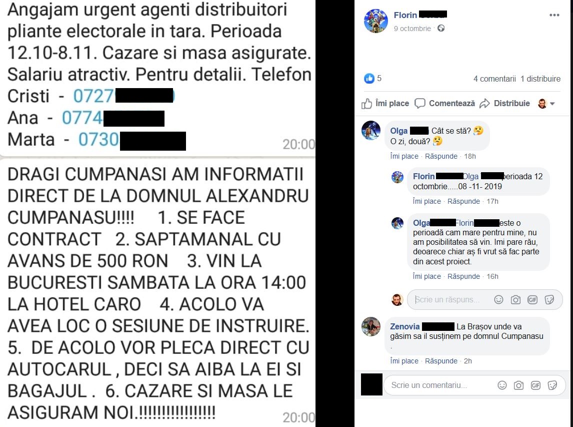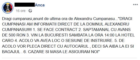”Dragi ”cumpănași”, am fost informații direct de la Domnul Alexandru Cumpănașu!!! Se face contract. Săptămânal cu avans de 500 ron. Vin la București sâmbătă, la ora 14:00, la hotel Caro. Acolo va avea loc o sesiune de instruire. De acolo vor pleca direct cu autocarul, deci să aibă la ei bagajul. Cazare și masa le asigurăm noi!!!”, se arată în mesajele distribuite masiv pe Facebook.