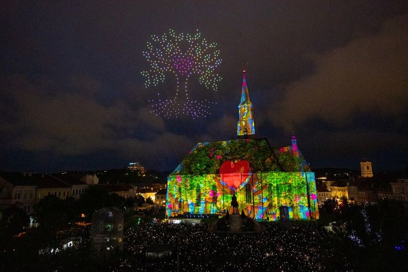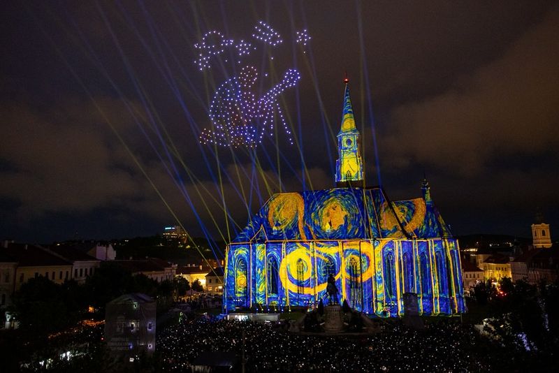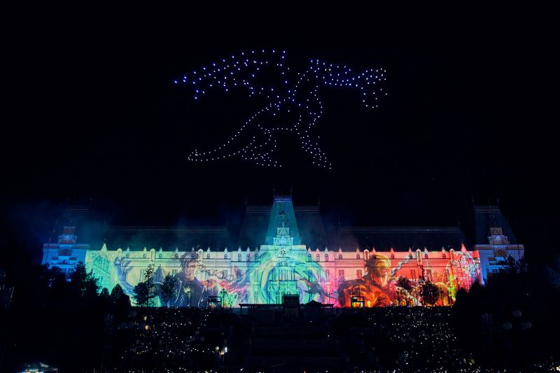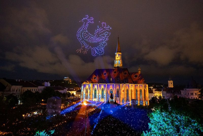 Spectacolul a pus în scenă un record național la Cluj, aducând pe cer 400 de drone, video mapping pe Biserica Sfântul Mihail și un design de lumini sincronizat cu o coloană sonoră încărcată de emoție.