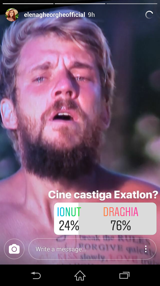 Frumoasa cantareata si-a intrebat fanii "Cine va castiga Exatlon?". Voturile au fost in favoarea lui Vladimir, 76% dintre cei care i-au raspuns Elenei la intrebare preferandu-l pe Faimos, in timp ce doar 24% au spus ca Ionut va iesi invingator din competitie.