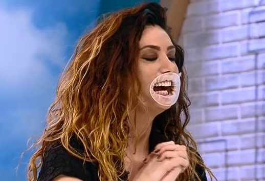 Claudia de la Cream a acceptat sa poarte o gutiera in direct si sa incerce sa rosteasca anumite cuvinte pentru ca Razvan Simion, prezentatorul emisiunii, sa le ghiceasca. (vezi si: Cum reuseste Claudia sa aiba un ten perfect)