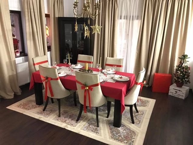 Fiecare scaun in parte a fost decorat cu o panglica de culoare rosie prinsa cu clopotel si crenguta de brad, fata de masa a fost tot rosie, iar tacamurile erau aranjate frumos langa vesela.