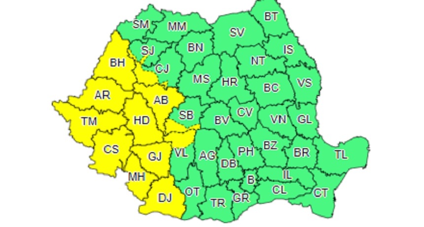 Avertizarea meteorologilor este valabila de luni ora 15:00 pana marti la ora 23:00. Judetele aflate sub avertizare sunt Bihor, Arad, Timis, Caras-Severin, Mehedinti, Dolj, Gorj, Hunedoara, Alba si, partial, Salaj, Cluj, Sibiu si Valcea.