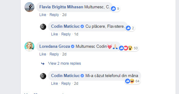 Flavia a intervenit imediat si a lasat un comentariu. „Multumesc, C”, a spus ea, iar Codin a raspuns: „Cu placere, Flavstere”.