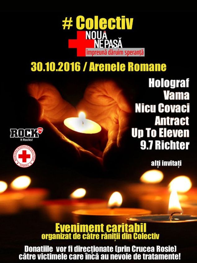 Banii strânşi în urma concertului de la Arenele Române din Bucureşti vor fi direcţionaţi prin Crucea Roşie către victimele care încă au nevoie de tratament. În acest eveniment sunt incluse atât formaţii tinere precum Up To Eleven sau 9.7 Richter, ai căror membri au fost răniţi în urma incediului din clubul Colectiv, cât şi artişti consacraţi, printre care se numără Holograf, Vama, Antract şi Nicu Covaci. Alţi participanţi vor fi anunţaţi în scurt timp.