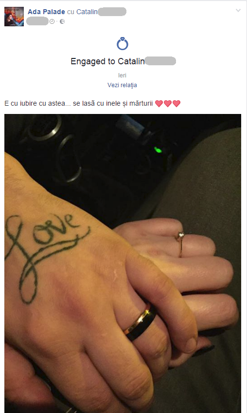 Mai mult, Ada a anuntat si pe pagina sa de socializare ca s-a logodit cu Catalin. A postat o imagine cu inele pe care le poarta amandoi, fotografie in dreptul careia a scris" E cu iubire, cu astea... se lasa cu inele si marturii".