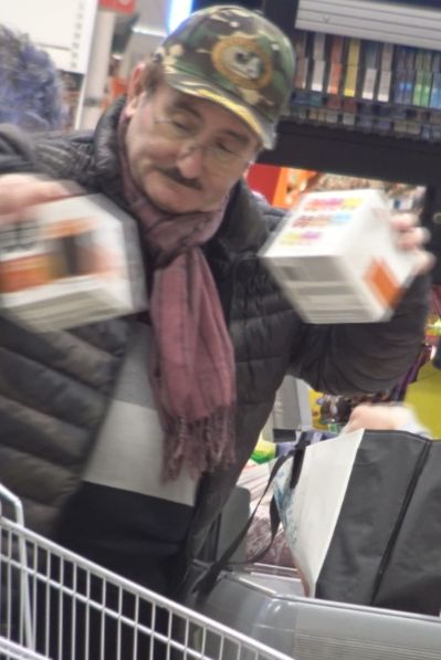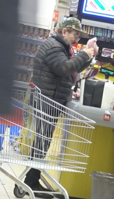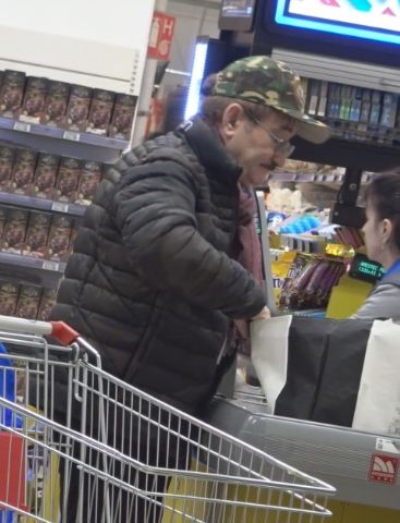 Acolo, echipat „de scandal”, cu o geacă neagră și o șapcă de camuflaj, Cornel Palade s-a achitat de însărcinarea primită cât a putut el de eficient, grăbindu-se spre casele de marcat. Și, după ce a pus cele cumpărate și scanate de casieră în cărucior – atenție, cam multă cafea, nu e de joacă – a scos un ditamai teancul de bancnote din buzunar și a plătit toate cele.