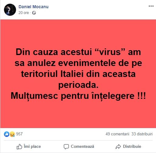“Dragii mei , pentru că sănătatea este cea mai importantă , am anulat evenimentele din Italia de weekendul acesta si o sa încercam sa le reprogramăm când o să avem dăți disponibile! Se pare ca nu e de glumă cu Coronavirusul ăsta, aveți grijă de voi si să ne vedem cu bine!”, a postat şi Culiţă Sterp, care avea spectacole la Milano şi Torino peste câteva zile.