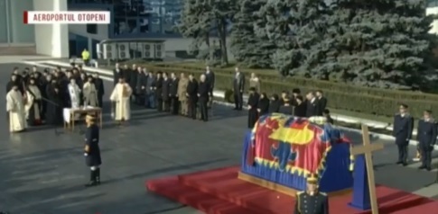Sicriul cu trupul Regelui Mihai a fost adus, miercuri, în România, cu o aeronavă militară, iar racla Majestăţii Sale a fost purtată către catafalc de 8 militari ai Brigăzii 30 Gardă. Pe Aeroportul Otopeni s-a desfăşurat o ceremonie, în cadrul căreia au fost intonate imnul naţional şi cel regal. Clopotele catedralelor, mănăstirilor şi bisericilor din întreaga ţară au fost trase la ora 11.00, atunci când sicriul cu trupul neînsufleţit al Regelui Mihai a sosit pe Aeroportul Internaţional Henri Coandă, dar şi la slujbele de înmormântare, anunţă Patriarhia Română.