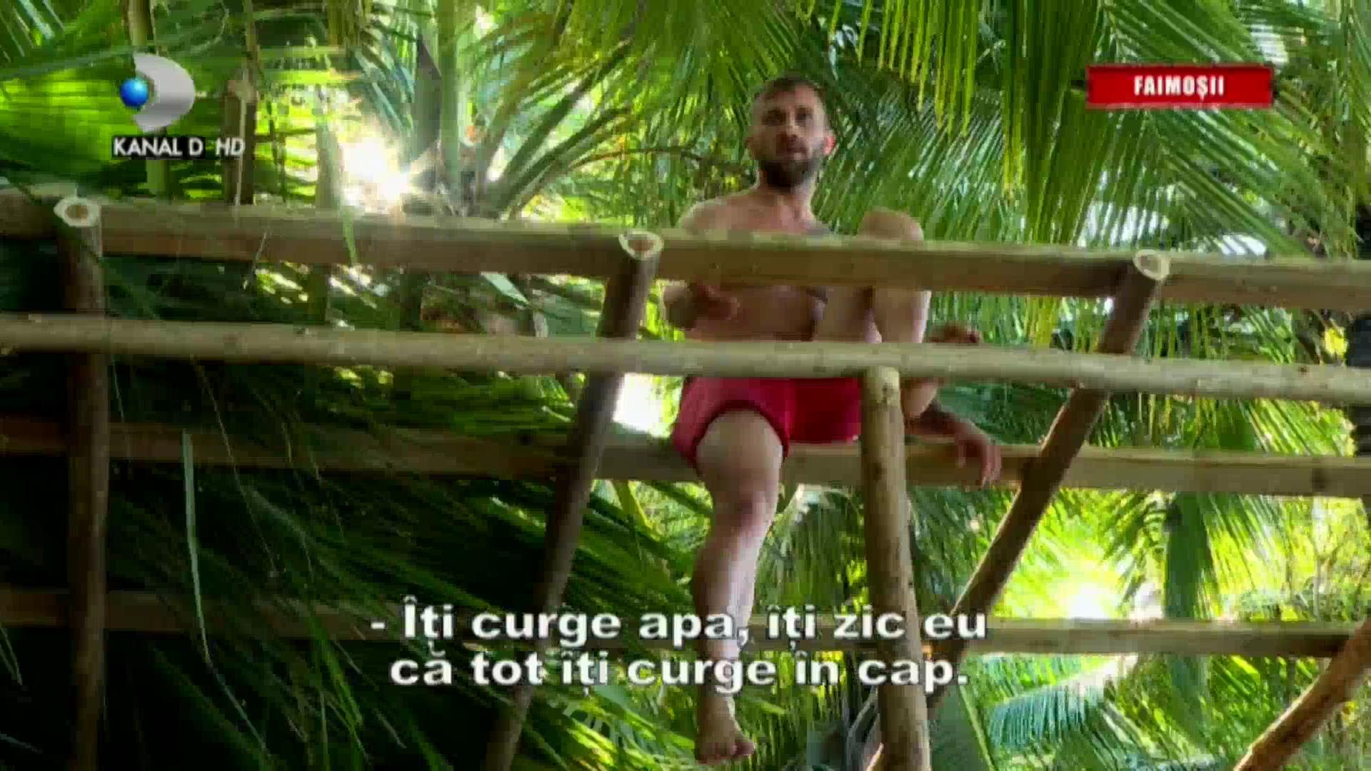 Până a ajunge să se lupte pe traseu pentru hrană, Faimoșii au nevoie să-și construiască un acoperiș deasupra capului. Cătălin Moroșanu de la Survivor România a început discuția, însă Zanni și Cosmin Stanciu sunt cei care s-au apucat să refacă acoperișul.