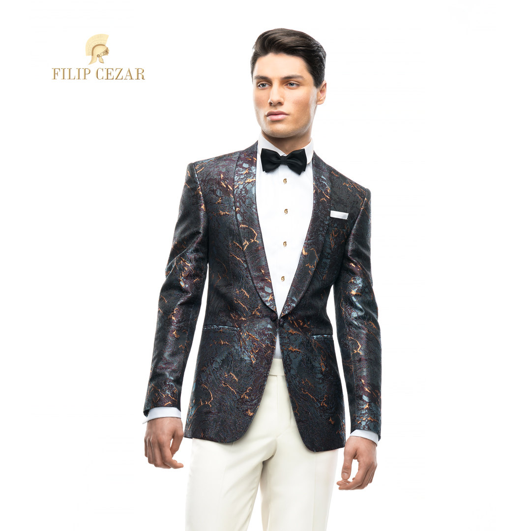 Bărbaţii pot experimenta imprimeurile florale la costumul de mire care sunt în tendinţele modei din acest an. Se poartă sacourile clasice sau de tip smoking bordeaux, bleumarin, sau alte nuanţe de culori, cu nasturi şi revere satinate.