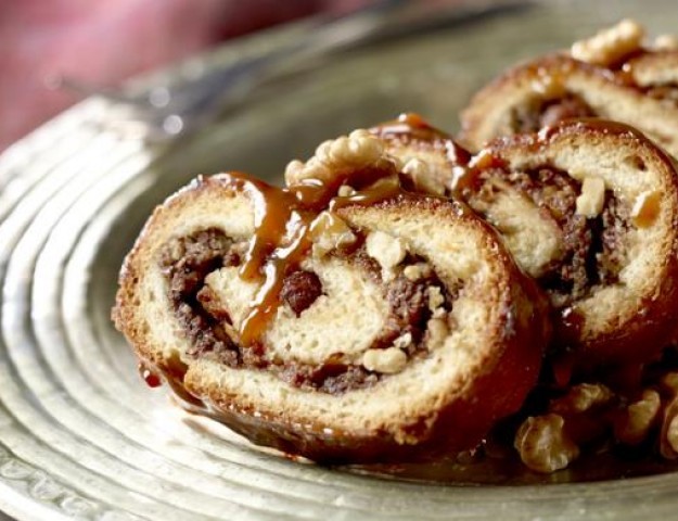 8. Rulăm aluatul ca pe o ruladă şi apoi îl punem în formă de cozonac. Înainte de a introduce cozonacul la cuptor îl crestăm deasupra cu un cuţit cam de 2-3 ori pe diagonală. Crestăturile trebuie să fie scurte, cam de ½ cm, tocmai pentru a crăpa frumos în timp ce e la cuptor. Coacem cozonacul timp de 35 – 40 de minute la 180 ° C. Imediat ce îl scoatem din cuptor, răsturnăm cozonacul, aşa fierbinte, pe un platou. Altfel, dacă este lăsat să se răcească, zahărul caramelizat se va întări şi nu va mai putea fi scos din formă.