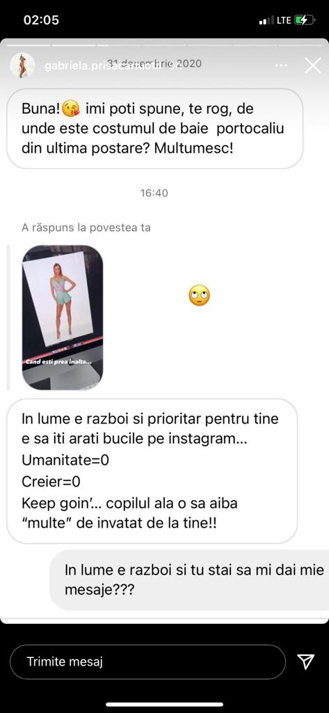 „În lume e război și tu sti să-m dai mie mesaje???”, a fost răspunsul pe care l-a oferit Gabriela Prisăcariu.