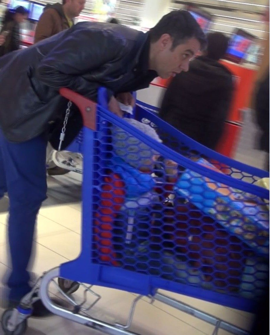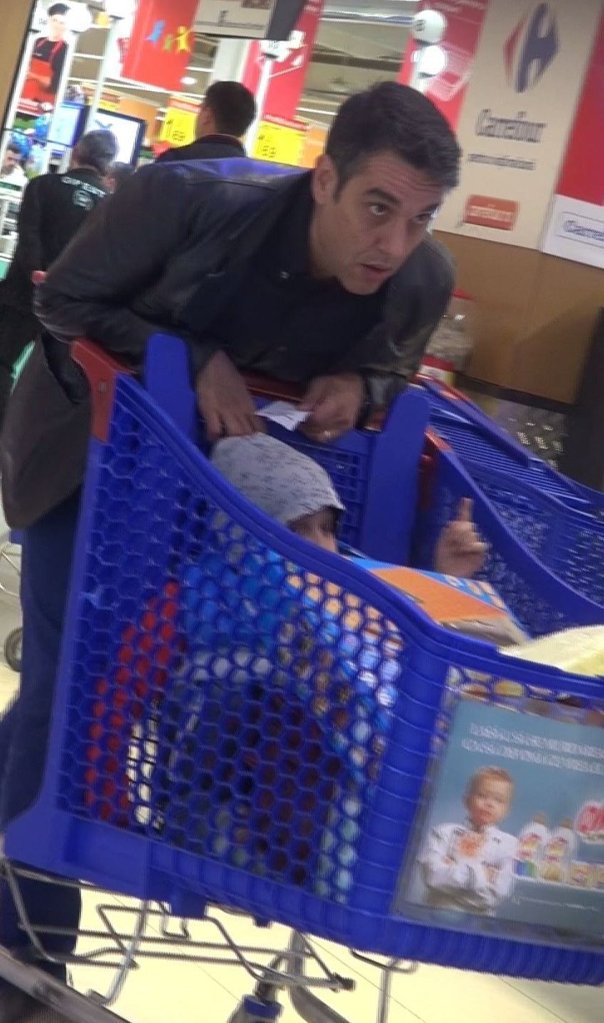 Fiul lui, Teddy, care implineste anul acesta 5 ani s-a suit in caruciorul destinat cumparaturilor, o miscare des intalnite la copiii de varsta lui. Pus in fata faptului implinit, Brancu nu a avut incotro si a inceput sa impinga vehicului, spre bucuria celui mic, mandru nevoie mare de "masinuta" lui.