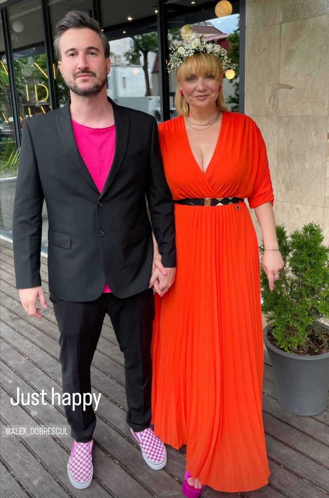 Alex a ales să îmbrace pentru petrecere un costum negru, cu tricou și încălțări roz, în timp ce la ceremonia religioasă și-a pus o cămașă albă la sacoul negru.
