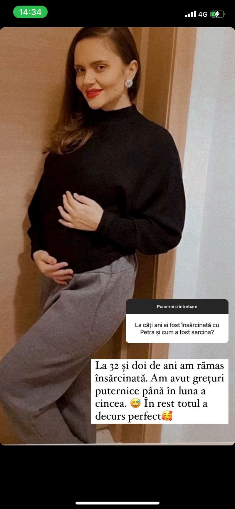 „La 32 de ani am rămas însărcinată. Am avut grețuri puternice până în luna a cincea. În rest totul a decurs perfect.”, a răspuns Cristina Șișcanu.