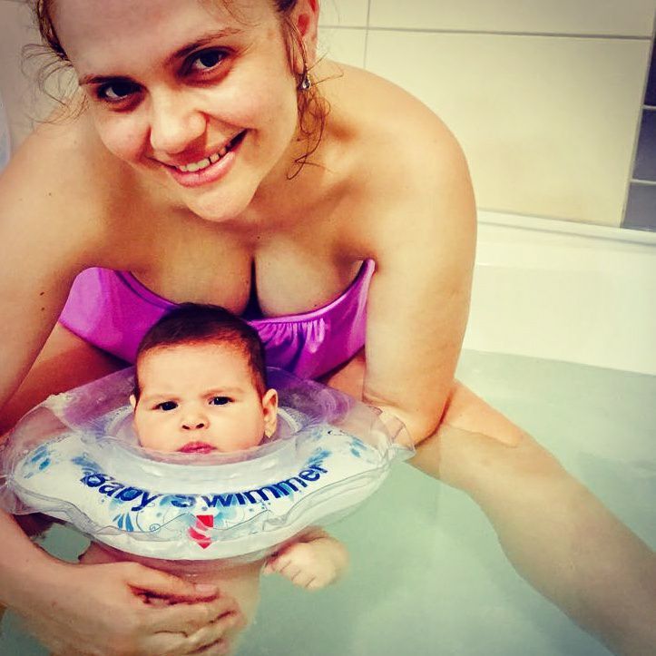 Cristina Siscanu si-a pus costumul de baie, a echipat-o pe micuta Petra cu un colac special, pentru bebelusi, si amandoua au intrat in cada, la prima sesiune de inot.