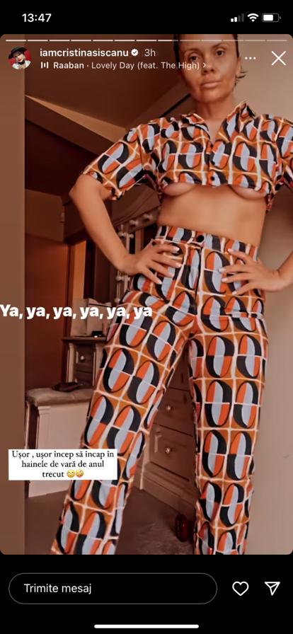 „Ușor, ușor încep să intru în hainele de vară de anul trecut. Colăceii s-au micșorat vizibil, dar mai sunt”, a spus Cristina Șișcanu pe Instagram.