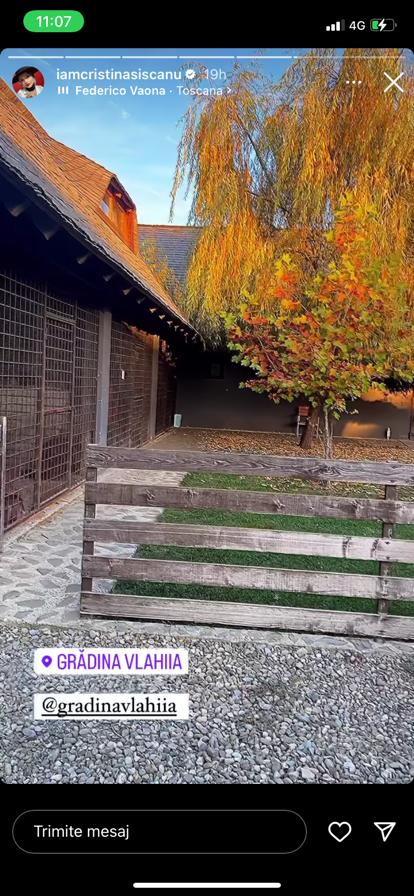 „Oricum e superb, e absolut superb cum arată, nu mai sunt bosumflată. Am venit la locul nostru de suflet, la grădina Vlahiia, în Snagov, venim deja de câțiva ani aici, facem diverse petreceri. Am mâncat bine și cu soțul acum ne uităm la animale, păsări, tot ce e aici și natura este absolut superbă, toamna asta este minunată”, a mai spus Cristina Șișcanu pe Instagram.