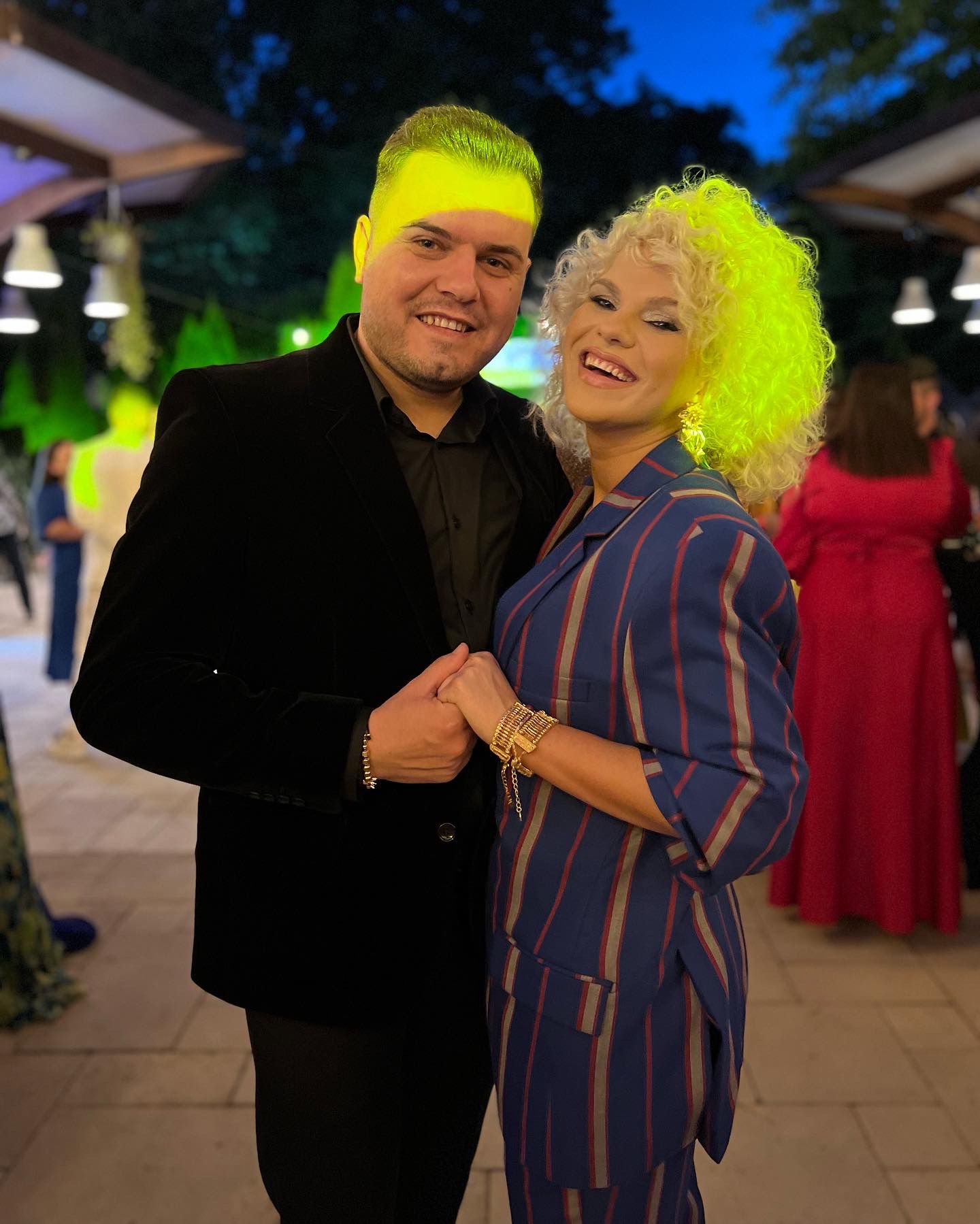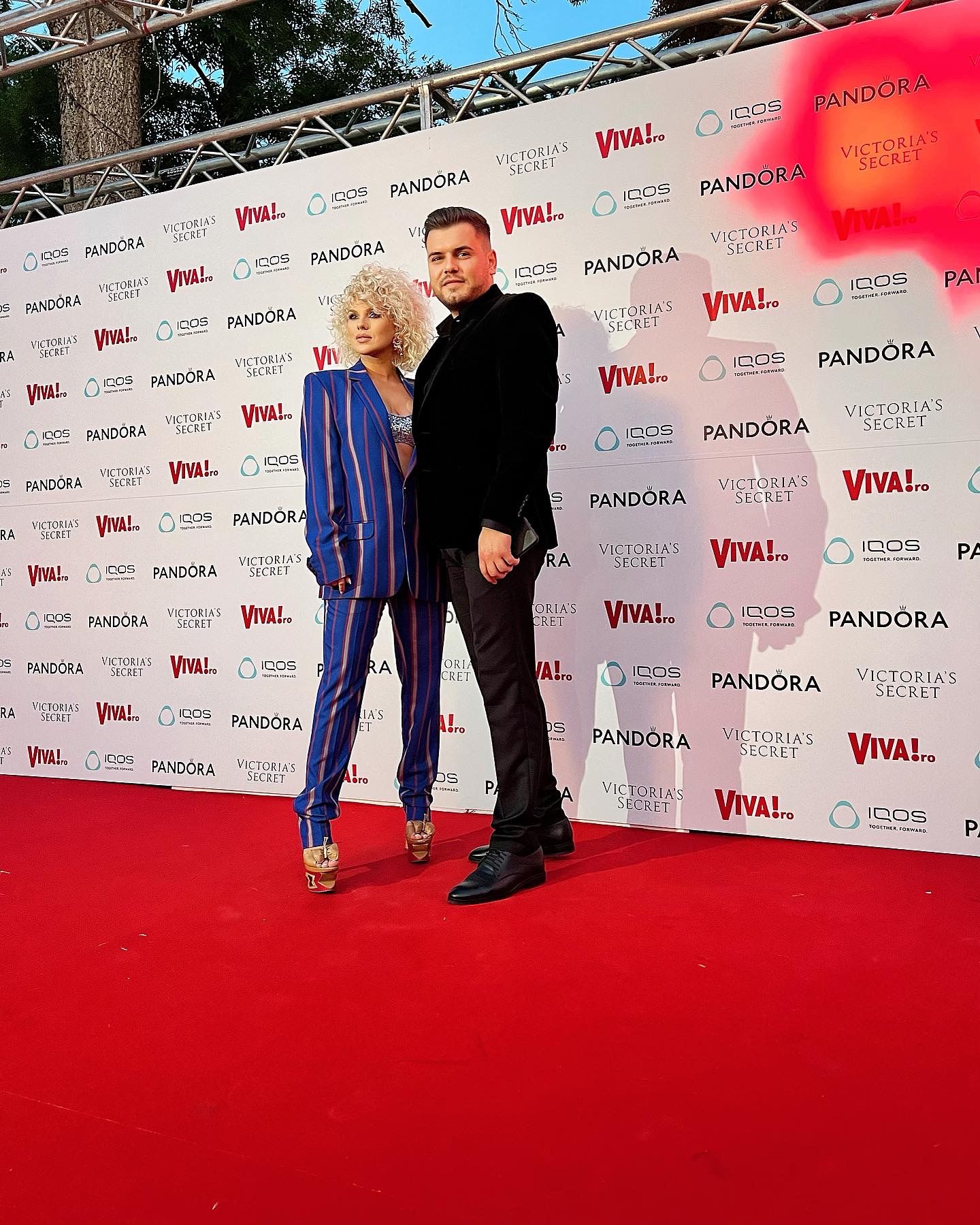 "Tematica evenimentului a fost “Colours in your eyes” și am optat pentru un costum bărbătesc oversize, albastru cu dungi colorate, pentru că mi-am dorit foarte mult să fiu comodă! Am avut un top pe dedesubt, și ținuta a fost lejeră pentru întreaga seară! Cătălin a optat pentru o ținuta all black, amândoi ne-am simțit extraordinar ca și cromatică, dar și ca piese