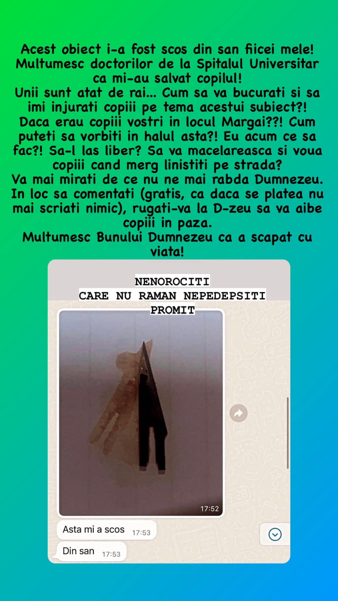„Acest obiect i-a fost scos din sân fiicei mele! Mulțumesc doctorilor de la Spitalul Universitar că mi-au salvat copilul! Unii sunt atât de răi...Cum să vă bucurați și să-și înjurați copiii pe tema acestui subiect?! Dacă erau copiii voștri în locul Margăi? Cum puteți să vorbiți în halul ăsta? Eu acum ce să fac? Să-l las liber să vă măcelărească și vouă copiii când merg liniștiți pe stradă? Vă mai mirați de ce nu ne mai rabdă dumnezeu. În loc să comentați (gratis, că dacă se plătea nu mai scriați nimic), rugați-vă la Dumnezeu să vă aibă copiii în pază. Mulțumesc bunului Dumnezeu că a scăpat cu viață”, a scris Viorica de la Clejani pe rețelele de socializare.