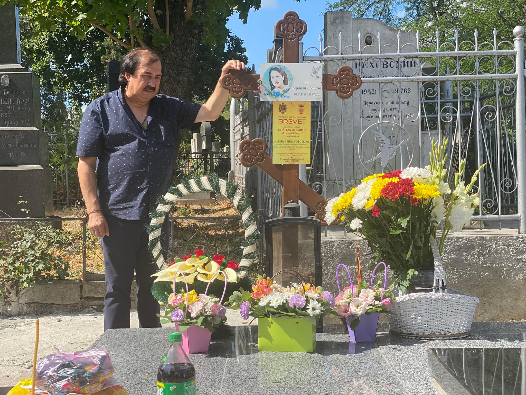 Imaginea publicată de Mariana Căpitănescu cu fiul lui Nicolae Botgros, la mormântul Lidiei Bejenaru
