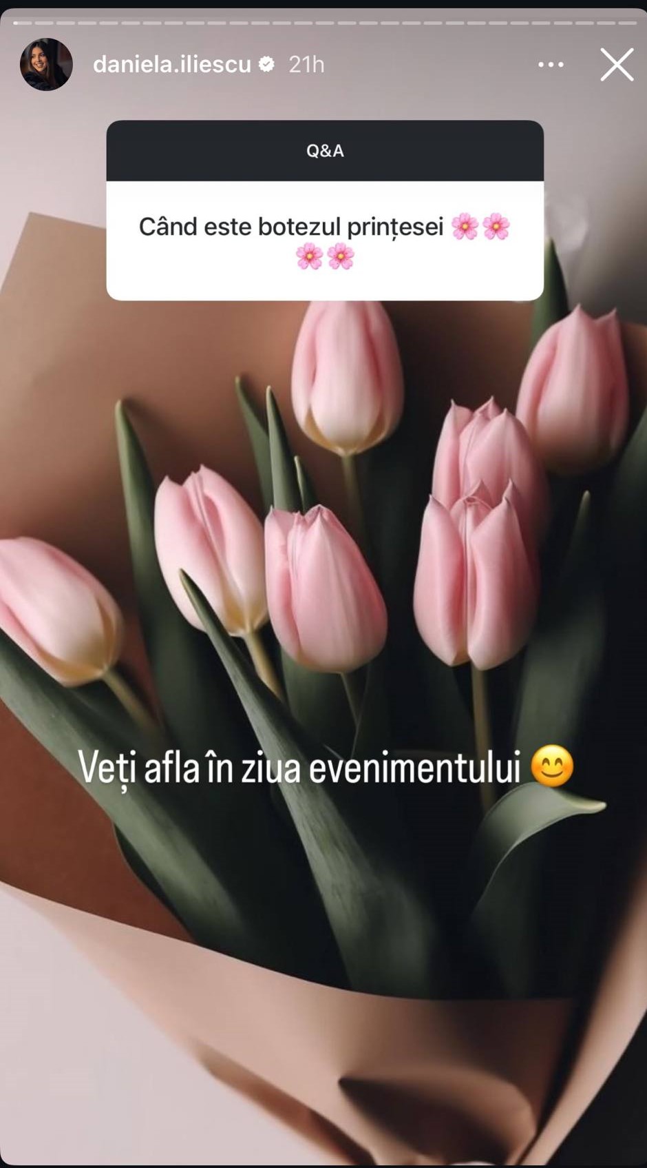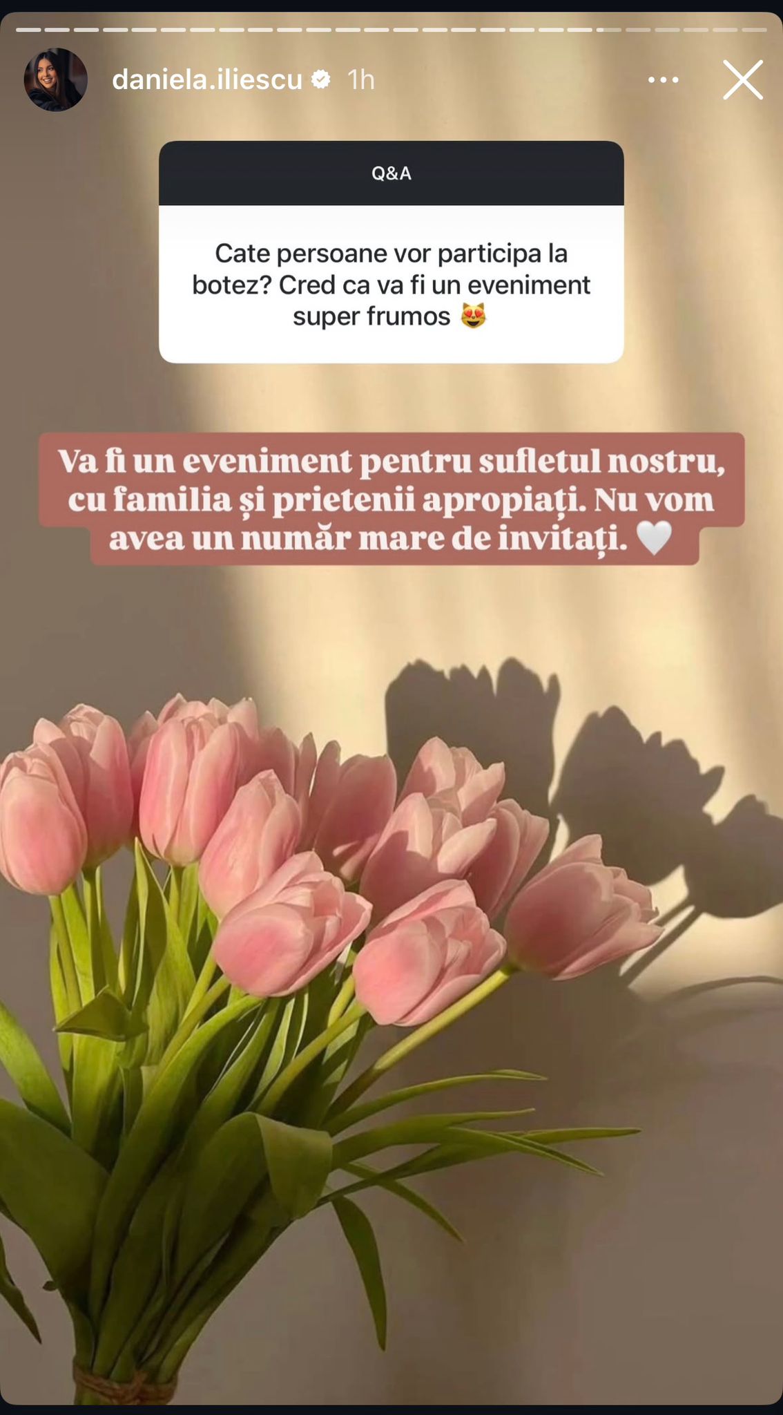 Daniela și Culiță o vor creștina pe micuța Miray, însă au de gând să organizeze o petrecere intimă, în familie.„Internaut: Câte persoane vor participa la botez? Cred că va fi un eveniment super frumos.
