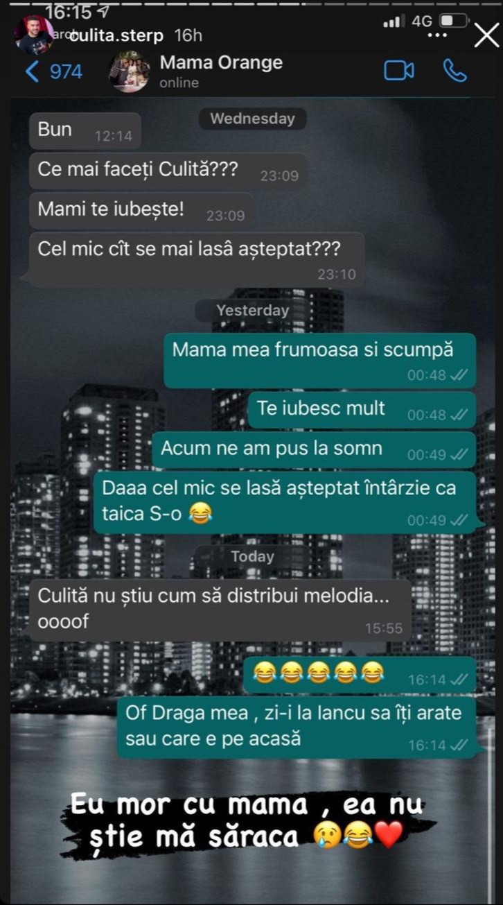 Pe pagina sa de Instagram, Culiță Sterp a împărtășit o conversație dintre el și mama lui. Mama Geta spera ca fiul ei să îi dea vești noi cu privire la sarcina Danielei Iliescu, care se apropie tot mai mult de momentul cel mare. Culiță Sterp i-a răspuns mamei sale și a glumit că micuțul se lasă așteptat, precum și el s-a lăsat așteptat după plecarea la Survivor România 2021.