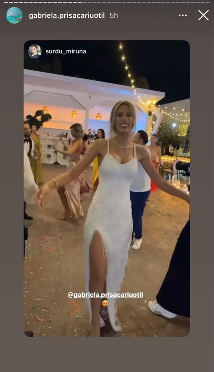 Până după dansul mirilor, Gabriela Prisăcariu a purtat o rochie de mireasă albă, amplă, ca de prințesă, foarte elegantă și rafinată. Trena și voalul au fost nelipsite, mai ales că modelul s-a visat dintotdeauna purtând rochia visurilor sale. Totul a devenit realitate ieri, când a pășit alături de alesul inimii sale în fața altarului.