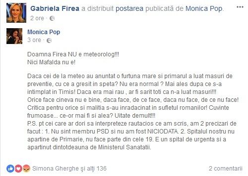 Ca raspuns, Gabriela Firea a distribuit pe Facebook postarea facuta de medicul Monica Pop, cu privire la acest eveniment.