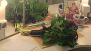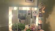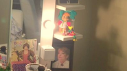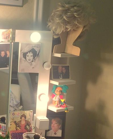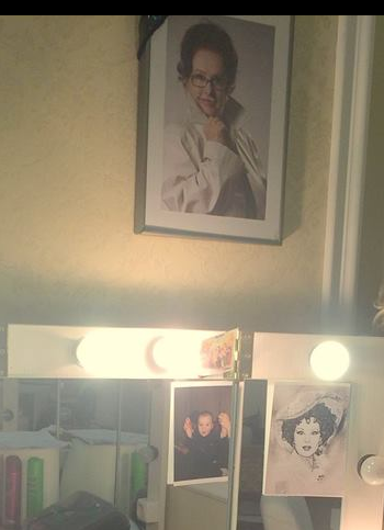 Pe oglinda sunt inca trei poze cu ea din diverse piese, iar pe rafturile de langa, este o fotografie cu ea si Puiu Maximilina, una cu Adriana Trandafir, o papusa si o peruca blonda!