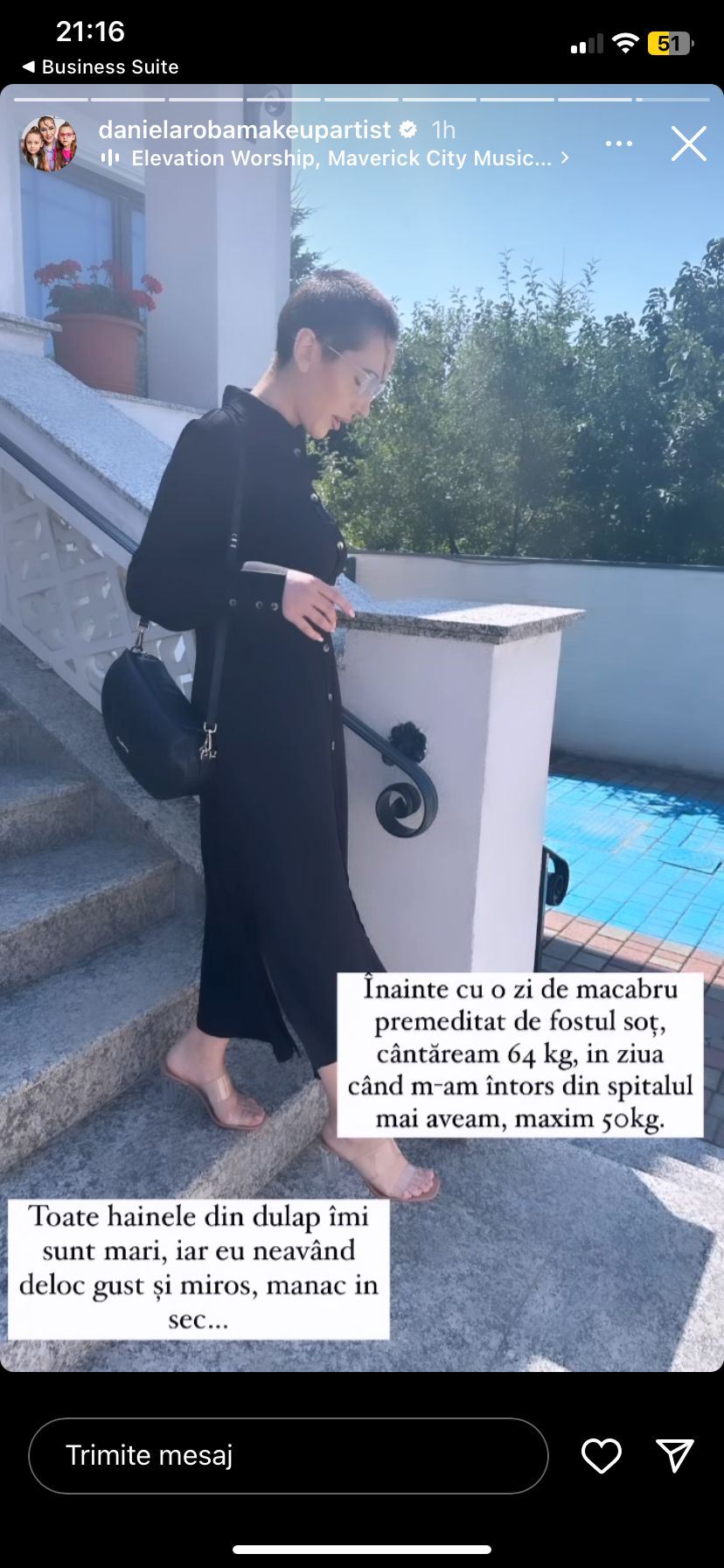 „Înainte cu o zi de macabrul premeditat de fostul soț, cântăream 64 kg, în ziua când m-am întors din spital mai aveam, maxim 50 kg. Toate hainele din dulap îmi sunt mari, iar eu neavând deloc gust și miros, mănânc în sec…”, a scris Dana Roba pe Instagram.