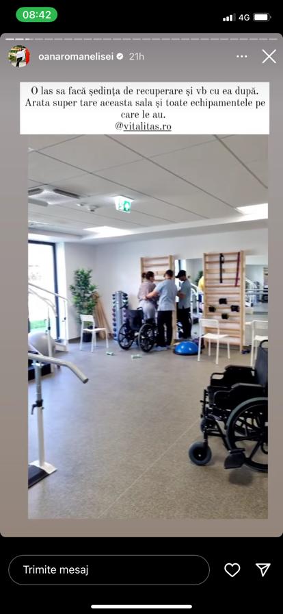 „Face recuperare medicală pentru o perioadă probabil de câteva săptămâni. Prețurile sunt cam la fel ca în ale centre de recuperare medicală cu internare. Este în jur de 500 de lei pe zi, preț care include cazare, mâncare, îngrijiri, medic și evident partea de recuperare”, a scris Oana Roman pe Instagram.