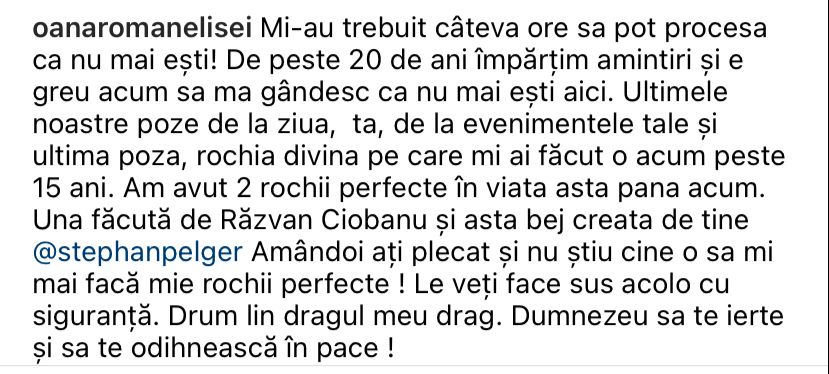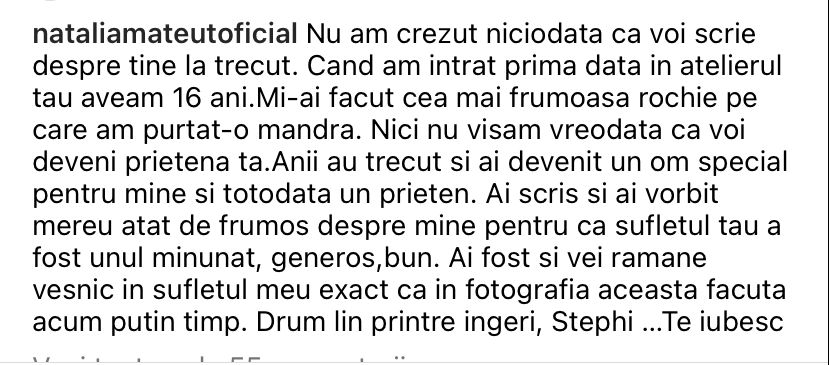 „Nu am crezut niciodata ca voi scrie despre tine la trecut. Cand am intrat prima data in atelierul tau aveam 16 ani.Mi-ai facut cea mai frumoasa rochie pe care am purtat-o mandra. Nici nu visam vreodata ca voi deveni prietena ta.Anii au trecut si ai devenit un om special pentru mine si totodata un prieten. Ai scris si ai vorbit mereu atat de frumos despre mine pentru ca sufletul tau a fost unul minunat, generos,bun. Ai fost si vei ramane vesnic in sufletul meu exact ca in fotografia aceasta facuta acum putin timp. Drum lin printre ingeri, Stephi …Te iubesc”, a scris Natalia Mateuț pe Instagram.