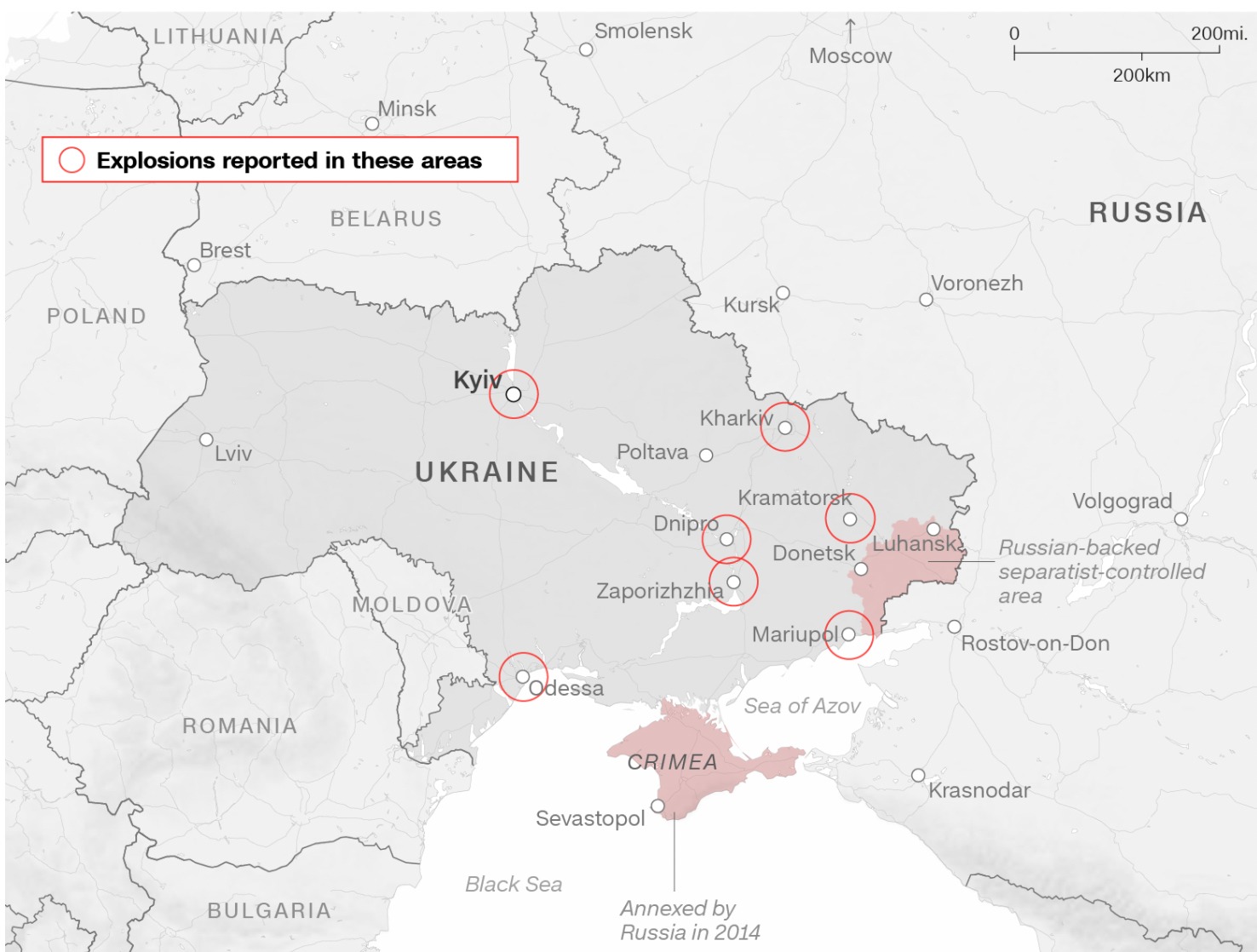 Astfel, totul s-a răspândit rapid în centrul și Estul Ucrainei, asta pentru că forțele ruse au atacat țara din trei părți. Înainte să se lumineze, oamenii din orașele Odesa, Dnipro, Mariupol și Kramatorsk au raportat explozii uriașe. În primă fază, detaliile legate de victime au fost neclare. Ministerul ucrainean al Apărării a susținut că trupele sale nu au suferit pierderi.