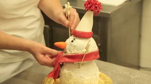 Peste aceşti bulgări turnăm glazura de ciocolata albă topită în prealabil şi apoi trecem prin fulgii de nucă de cocos. Aşezăm bulgării unul deasupra celuilalt, desenăm ochii, gura şi năstureii cu glazură de ciocolată, iar pentru nas, căciulă şi fular putem folosi marţipan roşu din comerţ ori preparat acasă.