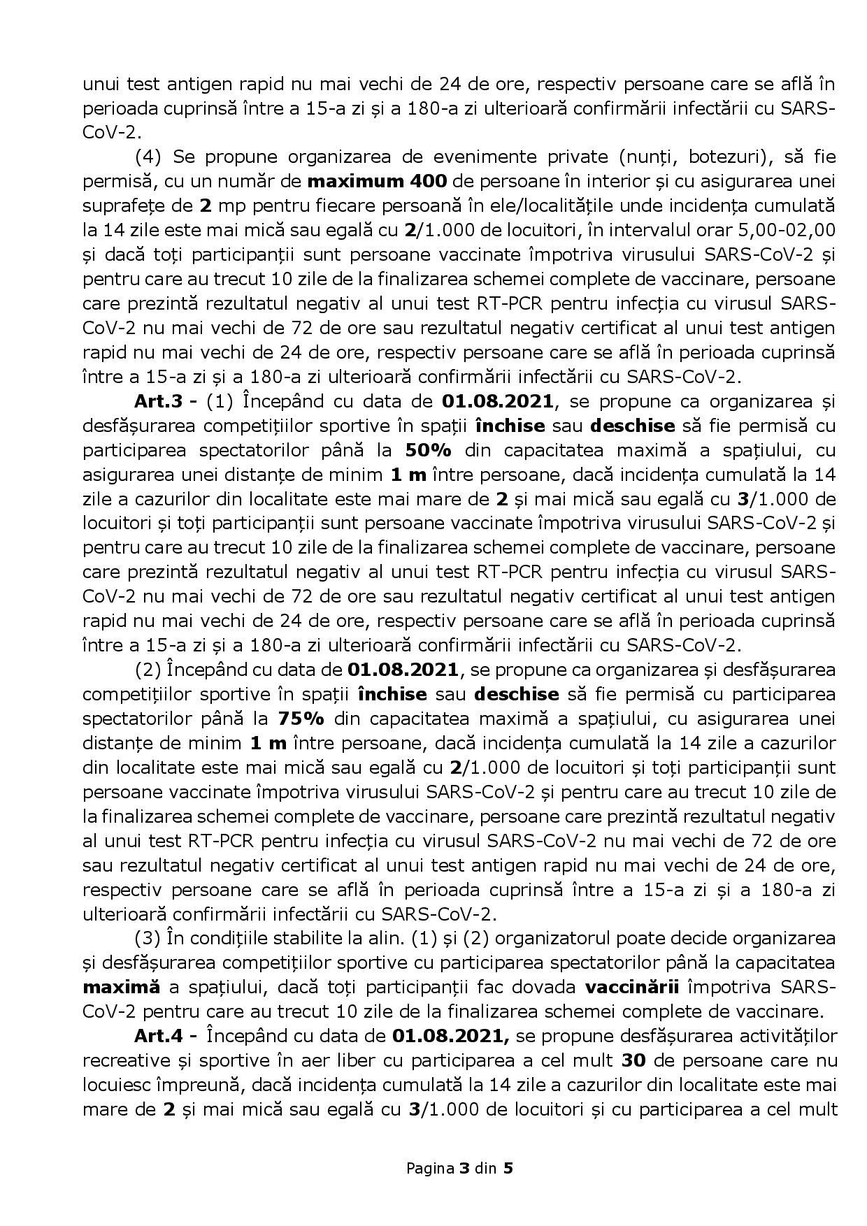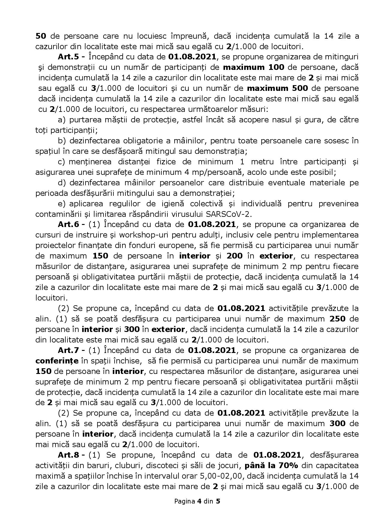 Începând cu data de 01.08.2021, se propune ca activităţile culturale, artistice şi de divertisment să poată fi organizate şi desfăşurate în spaţii deschise cu participarea a cel mult 75.000 de persoane, cu obligativitatea purtării măştii de protecţie, dacă incidenţa cumulată la 14 zile a cazurilor din localitate este mai mică sau egală cu 2/1.000