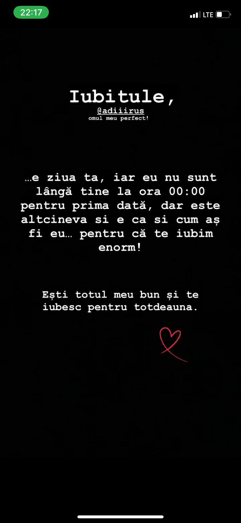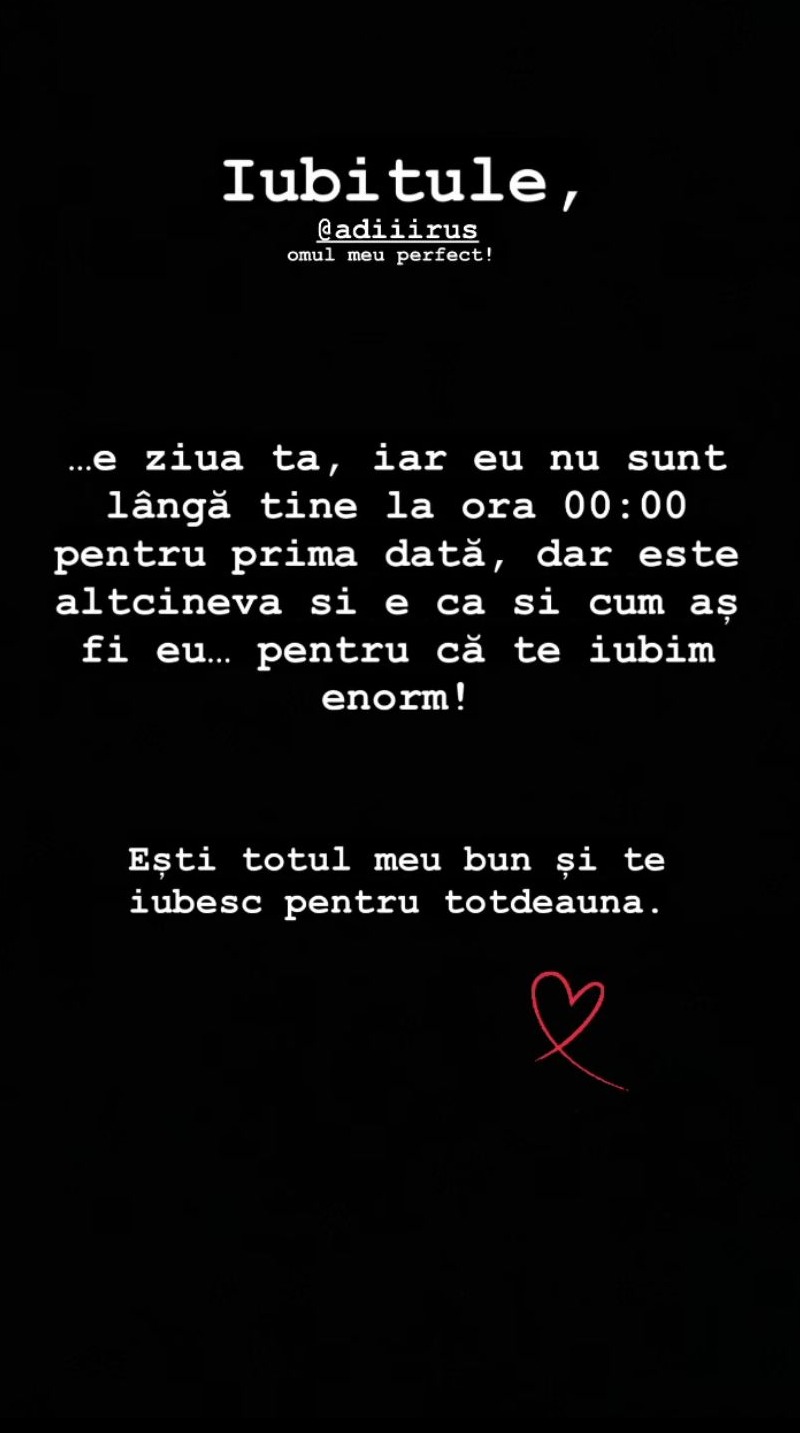 „Iubitule, @adiiirus omul meu perfect! E ziua ta, iar eu nu sunt lângă tine la ora 00:00 pentru prima data, dar este altcineva și e ca și cum aș fi și eu…pentru că te iubim enorm! Ești totul meu bun și te iubesc pentru totdeauna”, este mesajul pe care cântăreața i l-a transmis partenerului său de viață în mediul online.