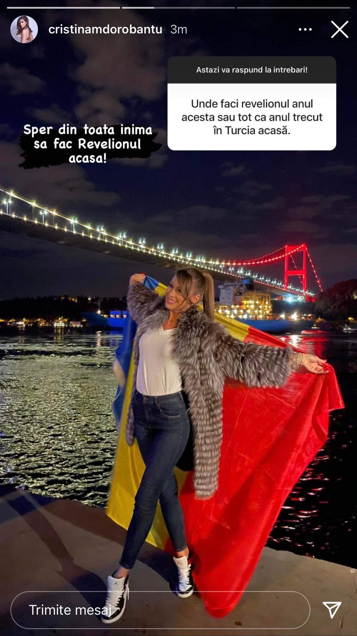 Cristina Mihaela s-a obișnuit deja cu ritmul acesta, dar și cu zborurile Istanbul – București și invers. Totuși, de data aceasta, vrea să facă sărbătorile acasă, alături de prietenii ei apropiați sau de familie. Cristina Mihaela nu vrea să-și petreacă noaptea dintre ani, în Turcia, fără cei dragi ei.
