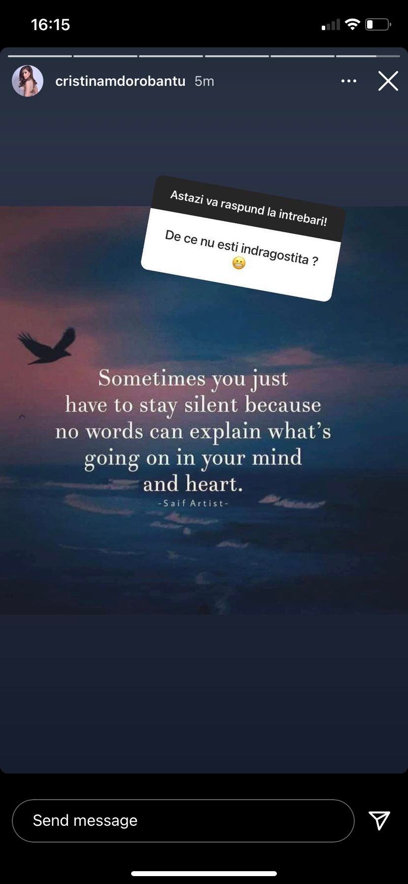 Prezentatoarea le-a oferit urmăritorilor ei de pe internet un răspuns la care nu prea se așteptau: ”Câteodată trebuie să fii tăcută pentru că niciun cuvânt nu poate explica ce se întâmplă în mintea și în inima ta”, se arată în postarea Cristinei Mihaela.