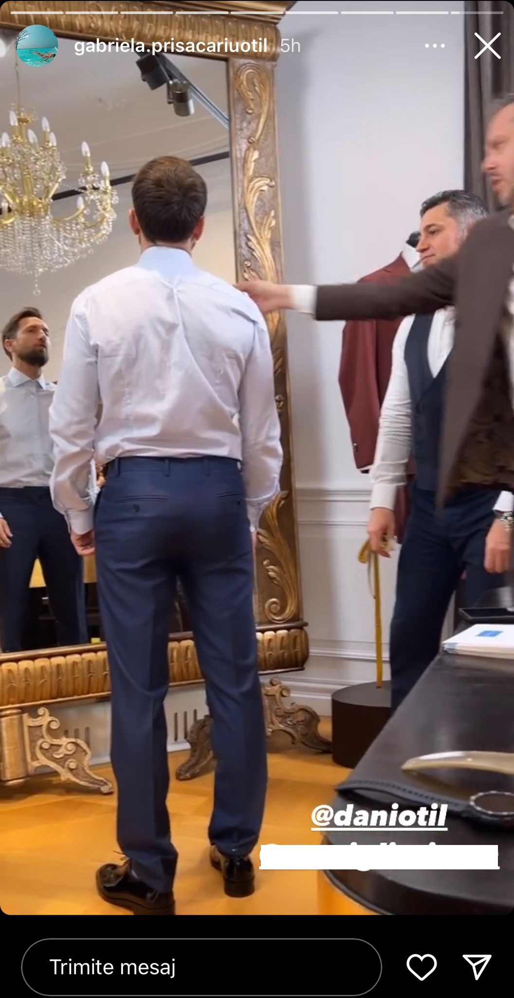 Gabriela Prisăcariu a distribuit pe rețelele de socializare un videoclip cu partenerul său de viață în timp ce își proba costumul de mire. Momentul a fost nelipsit de o reacție comică din partea blondinei, întrucât s-a amuzat copios pe seama sacoului lui Dani Oțil, care era vizibil cu mult mai mare decât mărimea de care avea nevoie.
