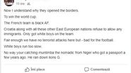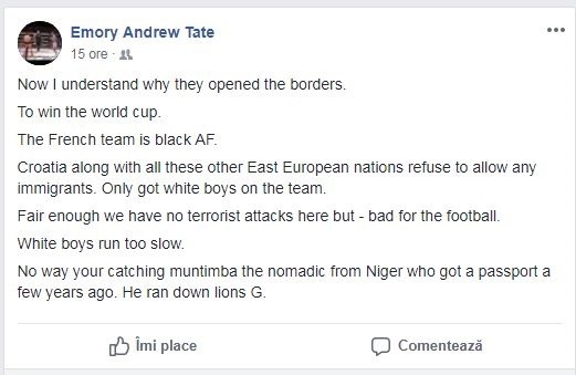 “Acum inteleg de ce au deschis granitele. Ca sa castige Cupa Mondiala. Echipa Frantei e neagra. Croatia, si alte echipe din Estul Europei, refuza sa accepte imigrantii. In aloc in echipele lor doar albi. E corect, nu avem atacuri teroriste, dar e rau pentru fotbal. Albii fug prea incet. Nu ai cum sa prinzi un nomad din Niger care ar epasaport de cativa ani incoace. El vaneaza lei…”, este postarea care, cu siguranta, ii va atrage antipatia care nu sunt interesati de culoarea pielii sau alte diferente dintre oameni. De altfel, cometariile, nu foarte multe la numar, il ironizeaza pe “cumnatul” Biancai Dragusau sau, mai rau, ii explica, cu argumente, de ce greseste si ca cele postate sunt… nedrepte.