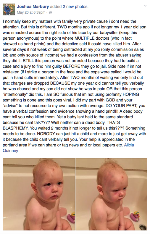 „Acum doua luni sau mai multe, fiul meu de 1 an a fost lovit peste fata de catre dadaca lui. Ii voi pastra numele anonim. Mai multi doctori, care ne-au aratat amprentele pe fata lui, si detectivi ne-au spus ca loviturile puteau sa il omoare. Dupa cateva zile sau saptamani in care am fost ocupat cu munca (lucrez in vanzari, pe comision, si e singura noastra sursa de venit), am primit marturisirea agresorului care ne-a spus ce a facut.