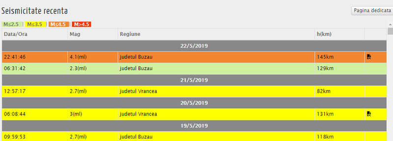 Totodată, dimineața trecută a mai avut loc un alt cutremur, având o magnitudine de 2.3 grade pe scara Richter. De asemenea, seismul s-a produs la o adâncime de 129 de kilometri. Cutremurul s-a produs în apropierea următoarelor orașe: Nehoiu(34km), Buzău(50km), Covasna(52km), Râmnicu Sărat(56km), Odobești(57km).