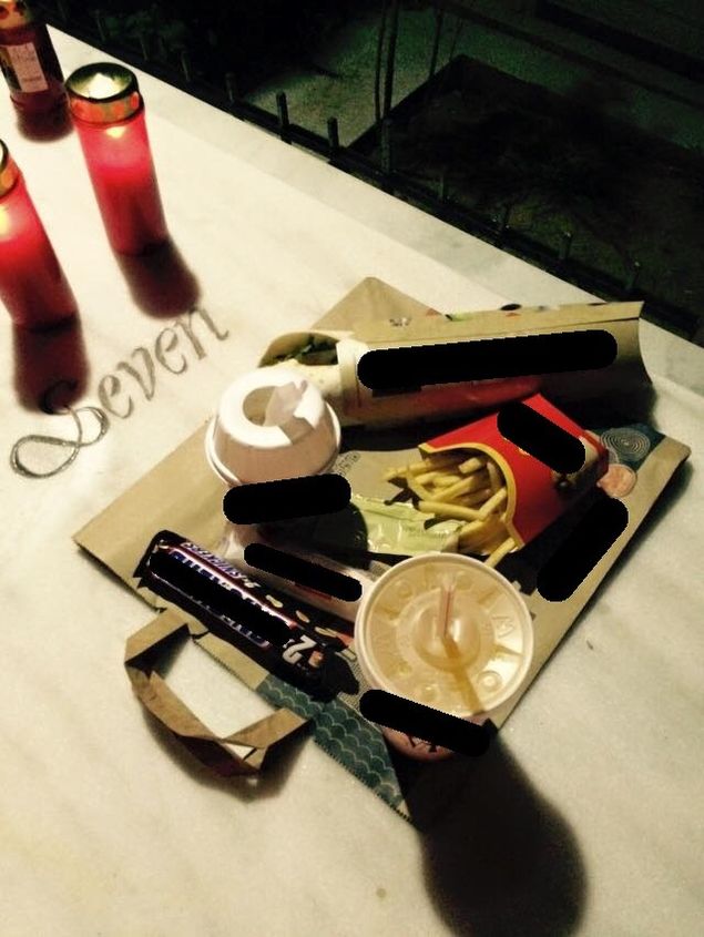 Asa arata produsele de fast-food aduse de Gianni la mormantul fiului sauPe langa lumanari si alte obiecte trebuincioase in cimitir, cei doi au cumparat special pentru Franco un meniu complet de la un lant celebru de fast- food-uri.
